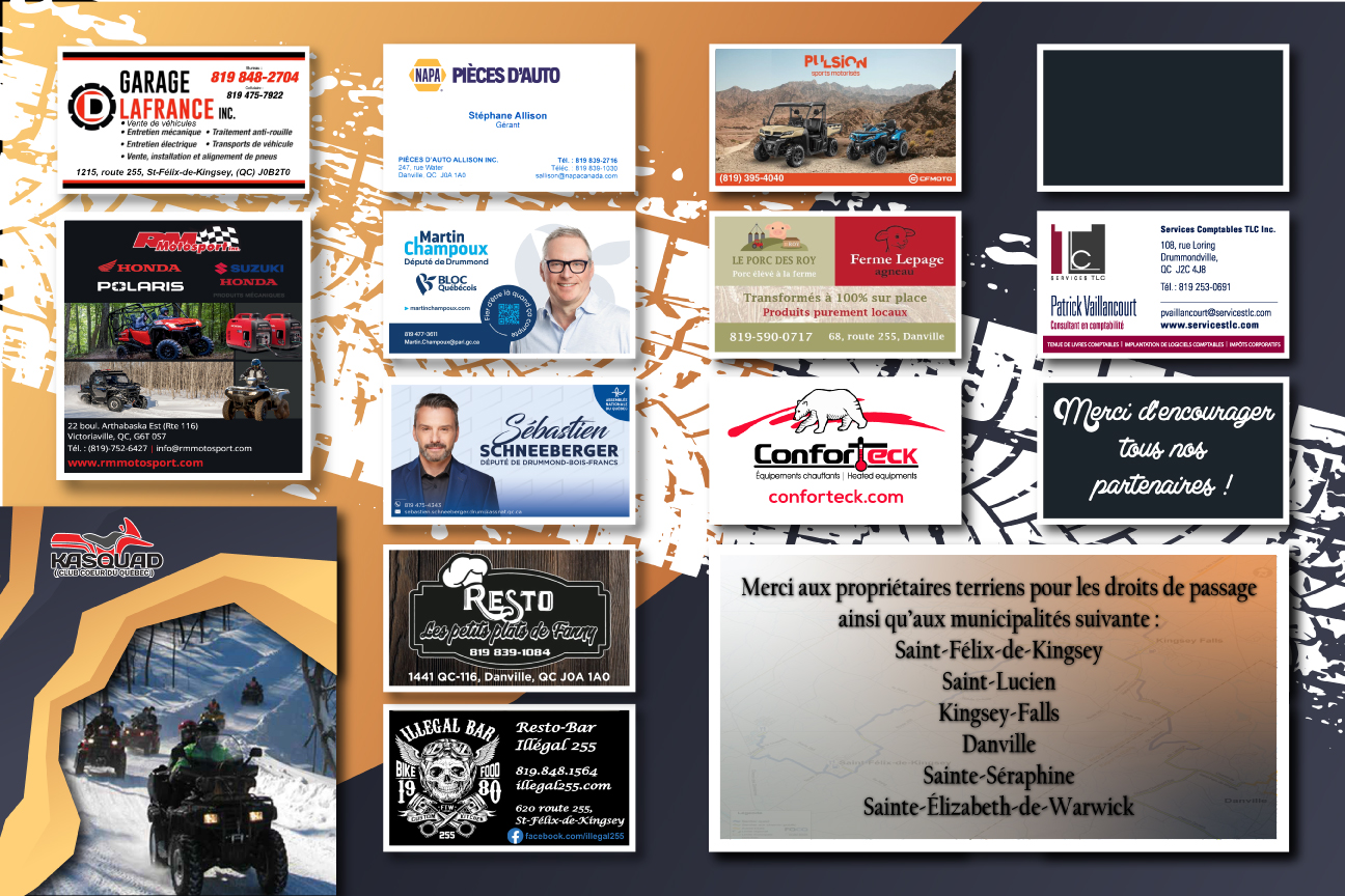 Le Club Kasquad tient à souligner l’appui essentiel de tous nos partenaires. Grâce à votre soutien financier et à votre confiance renouvelée, nous pouvons continuer d’entretenir, d’améliorer et de développer notre réseau de sentiers quad afin d’offrir aux quadistes une expérience sécuritaire, agréable et durable.